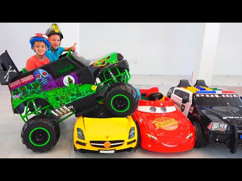 Vlad and Nikita ride on toy monster truck and goes through the cars for kids