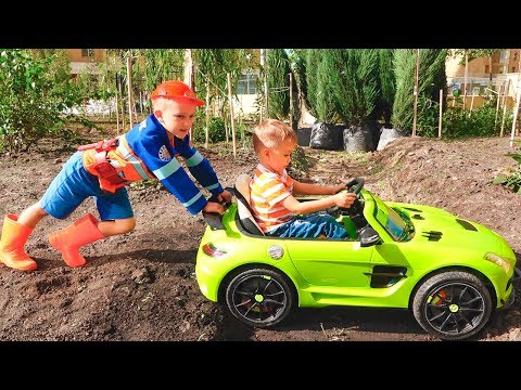 Nikita ride on children's car and stuck in the ground Vlad tows on the tractor