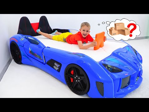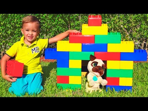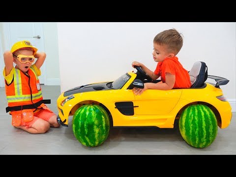 Vlad and Nikita Ride on Toy Sports Car & play with colored toy blocks
